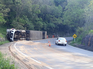 No final da tarde de quinta-feira (05/10), uma carreta cegonheira tombou na ERS 406, Km 2, na conhecida curva da morte.